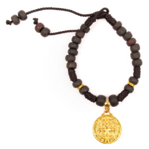 131 Pulsera de San Benito, de hilo tejida a mano color café obscuro con medalla dorada