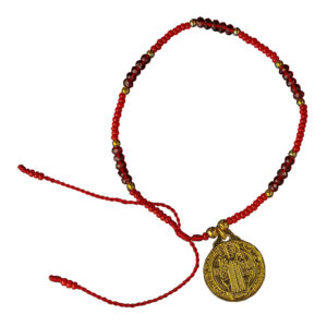 417 Pulsera tejida con cristal color rojo y medalla San Benito en chapa de oro